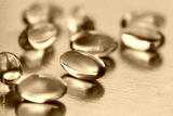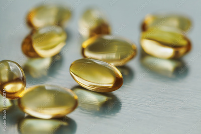 Yellow capsule with vitamin E tocopherol on blue surface, selective focus