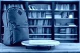 Books in library and wooden table desk with blue backpack and copy space for products and school supplies.