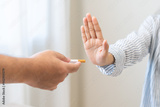 Quit smoking, stop smoke, addiction asian young woman, girl refusing cigarette, smoker quitting smoke, hand in refuse, deny tobacco. Quit bad habit, health care concept. Willpower lifestyle of people.