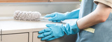 Happy housewife asian young woman worker wearing apron and rubber gloves at home, girl cleaning interior working in house, using duster to brush cupboard in living room. Hygiene tool for cleaning up.
