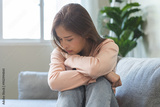 Sad, unhappy. Alone asian young woman, girl expression face thinking about problem, difficulty, feeling failure and exhausted, suffering from loneliness, grief sorrow and bad relationship or break up.