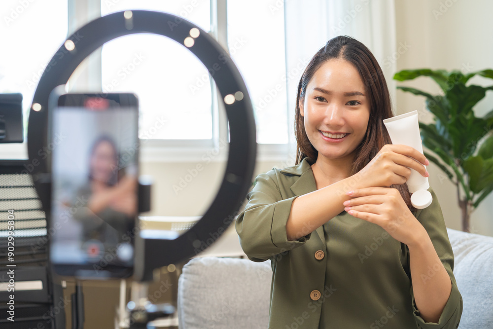 Influencer live internet, happy vlog asian young woman blogger using smart phone talking on video streaming podcast review online on social media, digital marketing with mobile content creator concept