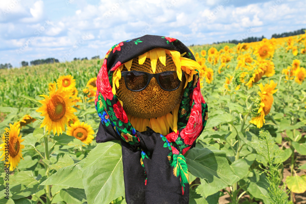 Ripe sunflower in black head scarf and sunglasses. Technical, agricultural, oilseed crop. Single sunflower head in headkerchief. Harvest and fodder for livestock. Plot view of sunflower in sunglasses