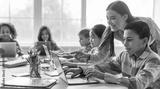 Teacher Teaching Diverse School Kids Using Laptop In Classroom. African American Schoolboy And Diverse Classmates Browsing Internet On Computer Learning Online Indoor. E-Learning Concept