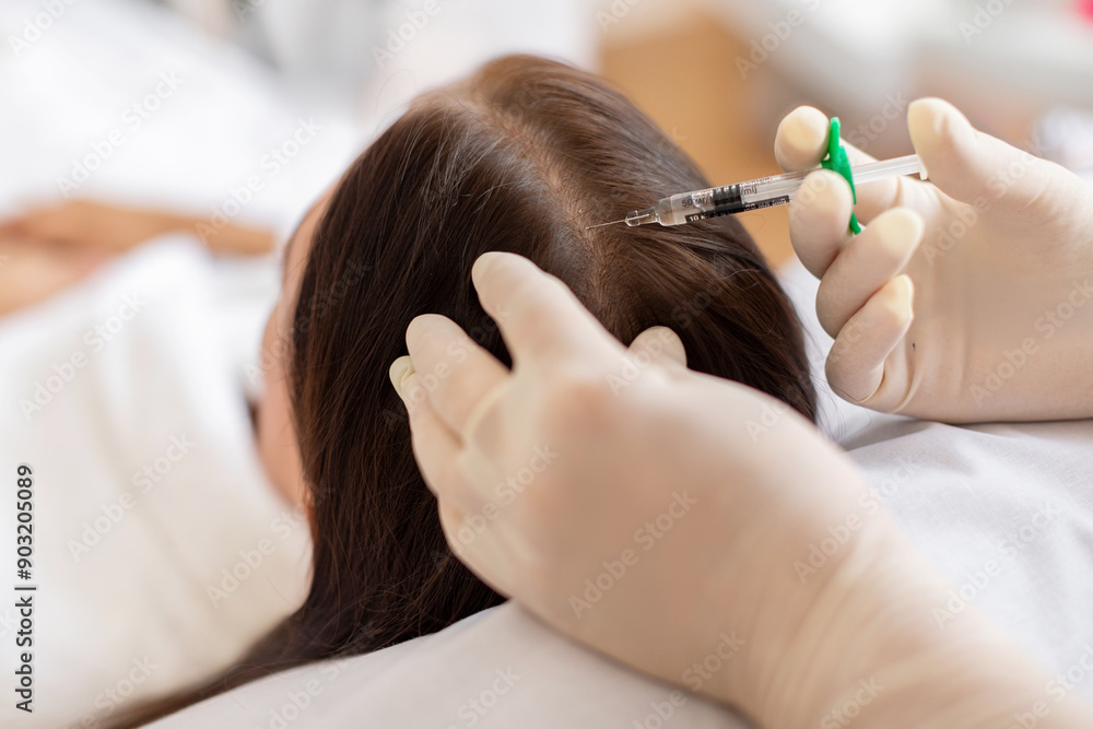 Beautician injections for healthy hair growth. Mesotherapy of the scalp. Woman undergoing course of spa treatments in the office of beautician