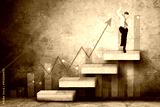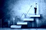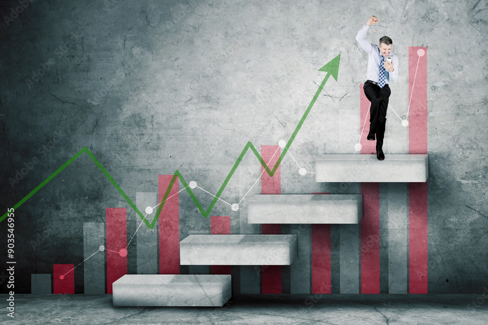 Happy caucasian businessman standing on a stair case using a mobile phone