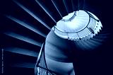 Black and white photograph of spiraling staircase shot from low angle.