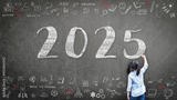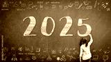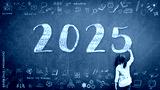 2025 Happy new year school class academic calendar with student kid's hand drawing greeting on teacher's black chalkboard for educational celebration, back to school, STEM education classroom schedule