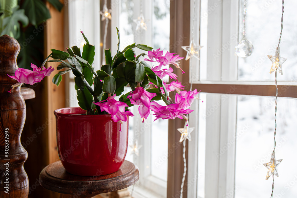 Cultivar belonging to the Schlumbergera Truncata Group called Christmas cactus or Thanksgiving cactus. Flower growing in flower pot in home, full bloom with snowy landscape seen from window.