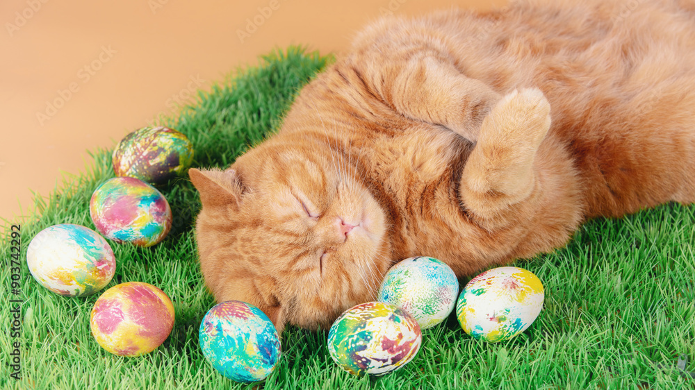 A funny ginger cat sleeping on artificial turf near colored easter eggs