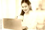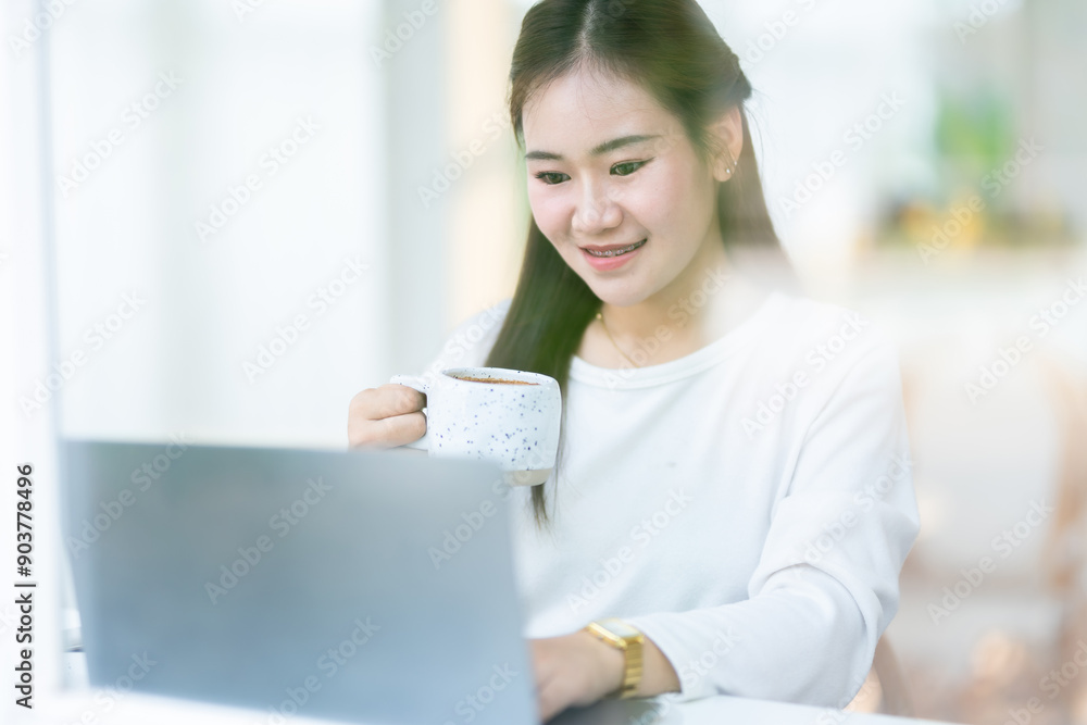 Portrait of beautiful happy Smiling of hands Holding cup mug of Hot coffee latte wits business female casual working with laptop computer in coffee shop like the background,communication concept