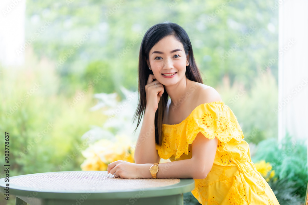 Portrait of beautiful happy Smiling asian woman relaxing sitting in yellow dress at cafe interior in coffee shop background,Business Lifestyle summer holiday concept
