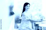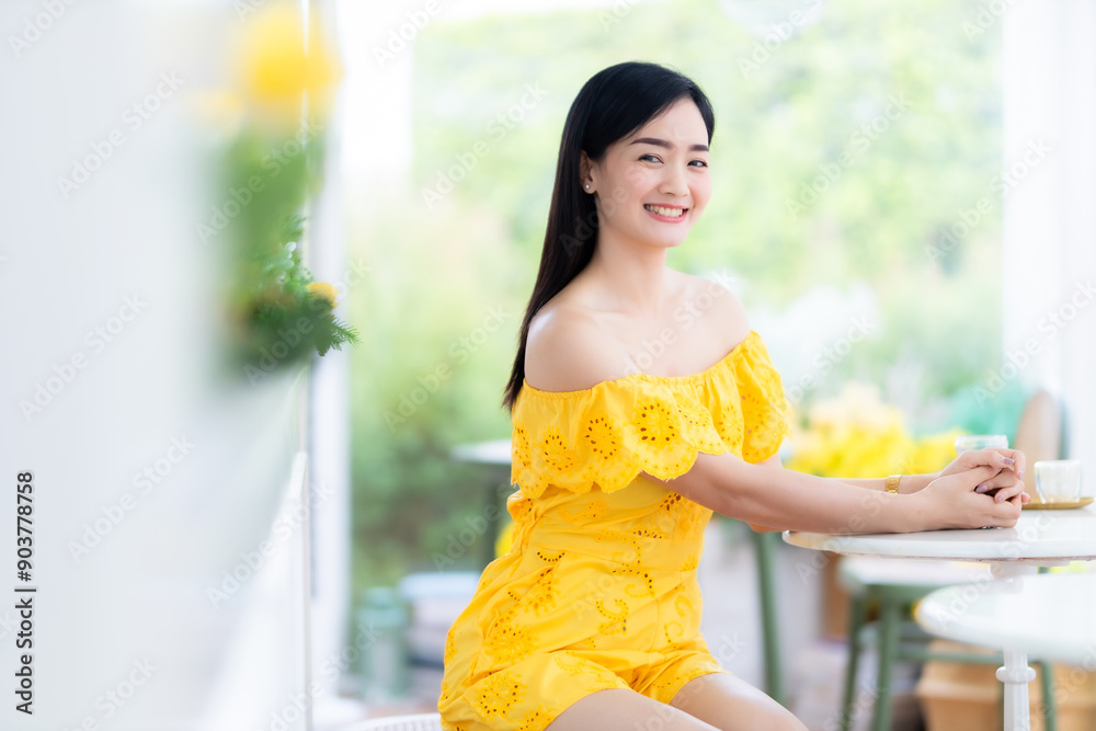 Portrait of beautiful happy Smiling asian woman relaxing sitting in yellow dress at cafe interior in coffee shop background,Business Lifestyle summer holiday concept