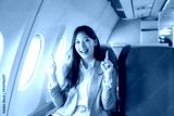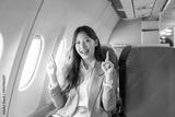 An Asian businesswoman travels abroad by plane, sitting near the window. She reads a book and uses her computer, utilizing her airline credit card to manage travel expenses efficiently.