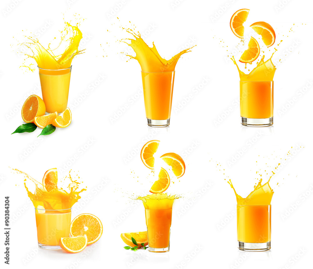 Collage of orange juice splashes isolated on white