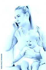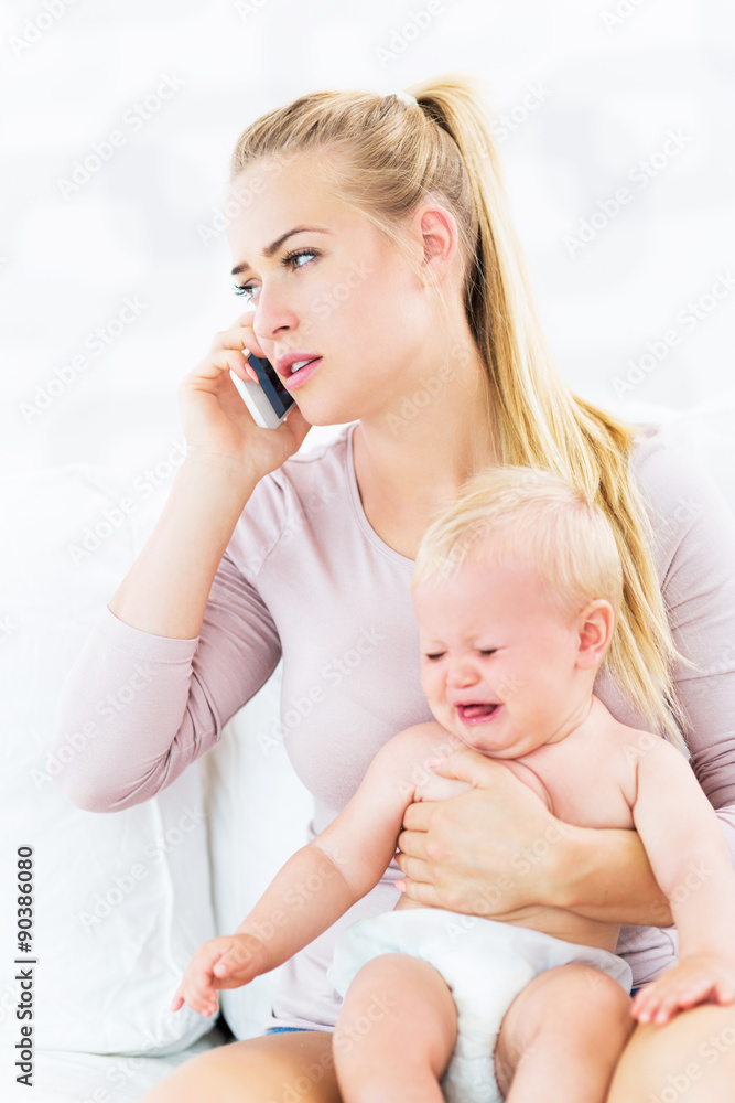 Woman holding crying baby talking on mobile phone