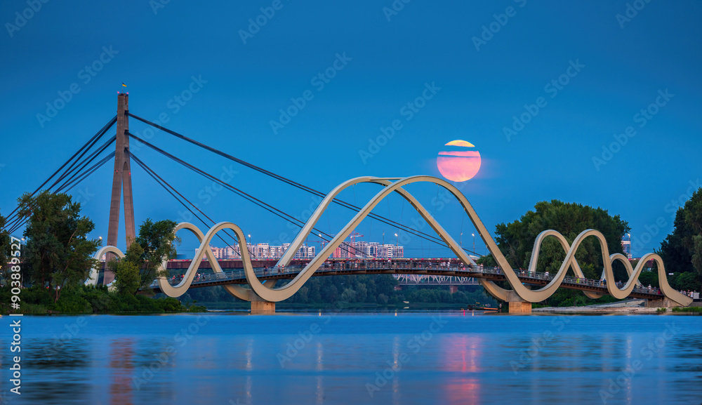 Pink Thunderstorm Full Moon rises on the background of pedestrian bridge in Obolon district, Kyiv, Ukraine