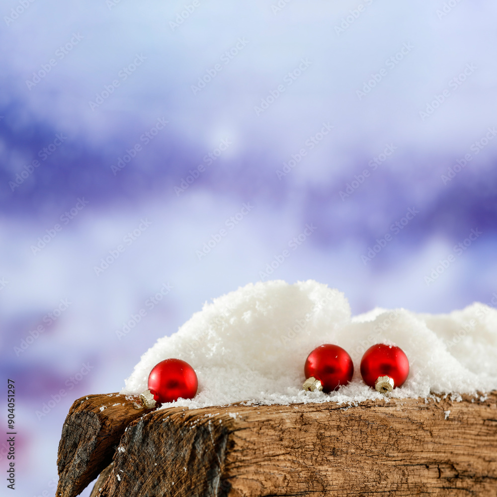 Red christmas ball on snow on wooden board with blurred snow falling and shimmering background.
