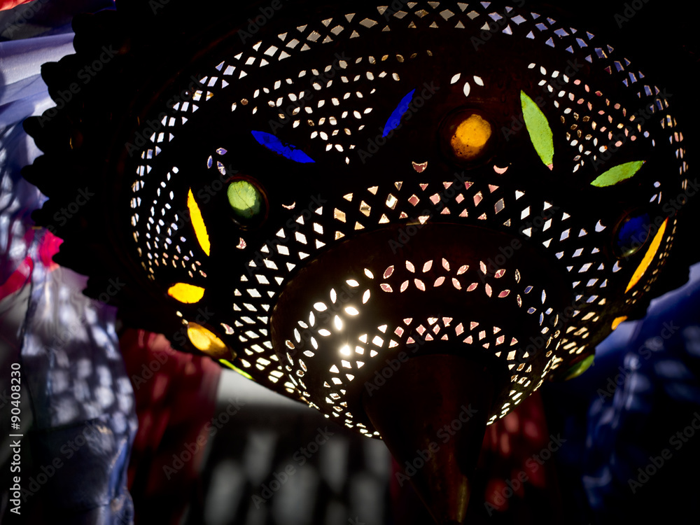 Moroccan style lamp with glass inset, exotic, mysterious and beauiful. Interior.