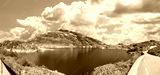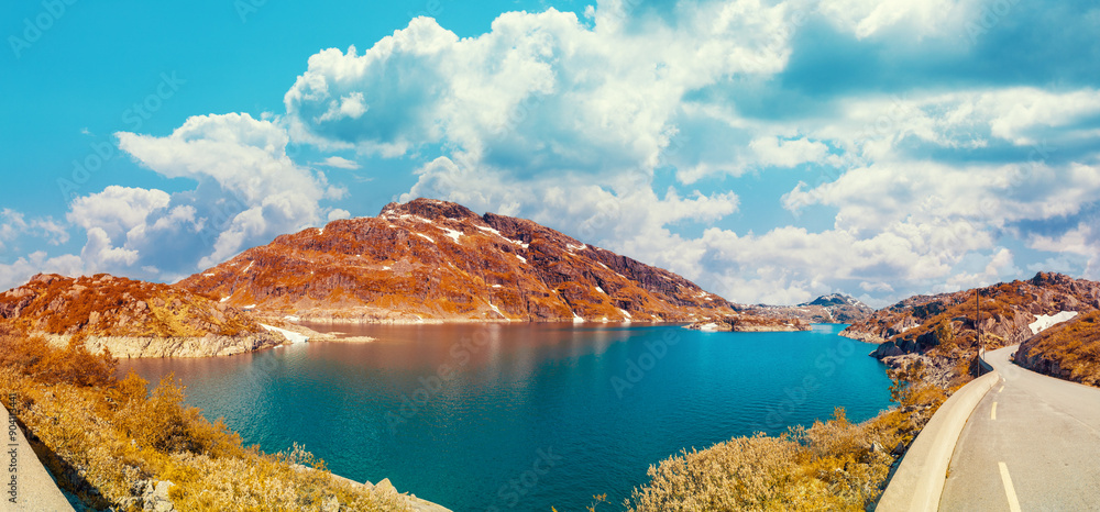 Panoramic view of the mountain lake Svartevatnet in Sauda municipality. Beautiful nature of Norway. Horizontal banner
