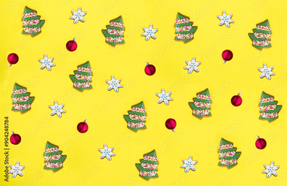 Christmas gingerbreads and red bead on the yellow background. Top view. Flat lay.