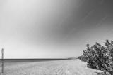 Sunny beach landscape with clear blue sky, calm turquoise water and sandy shore lined with green bushes on bright day. Crete.