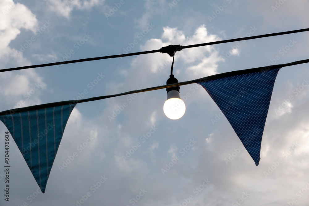 Lights on and pennants hanging with the sky in the background.