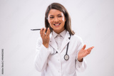Portrait of happy doctor who is talking on phone with patient.