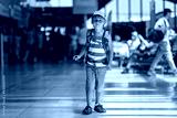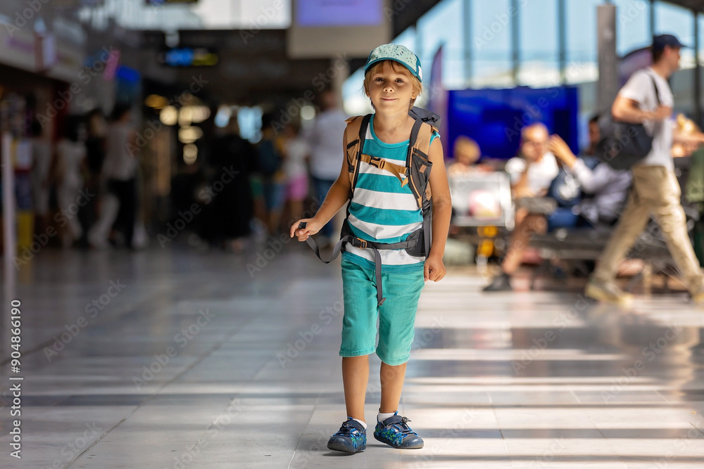 Sweet children, brothers, boys, waking hand in hand at the airport, carrying suitcases and backpacks