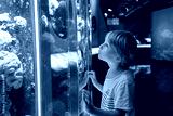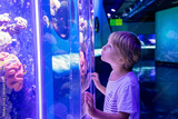Little boy, kid watching the shoal of fish swimming in oceanarium, children enjoying underwater life