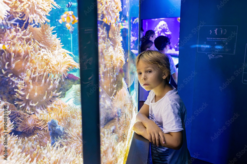 Little boy, kid watching the shoal of fish swimming in oceanarium, children enjoying underwater life