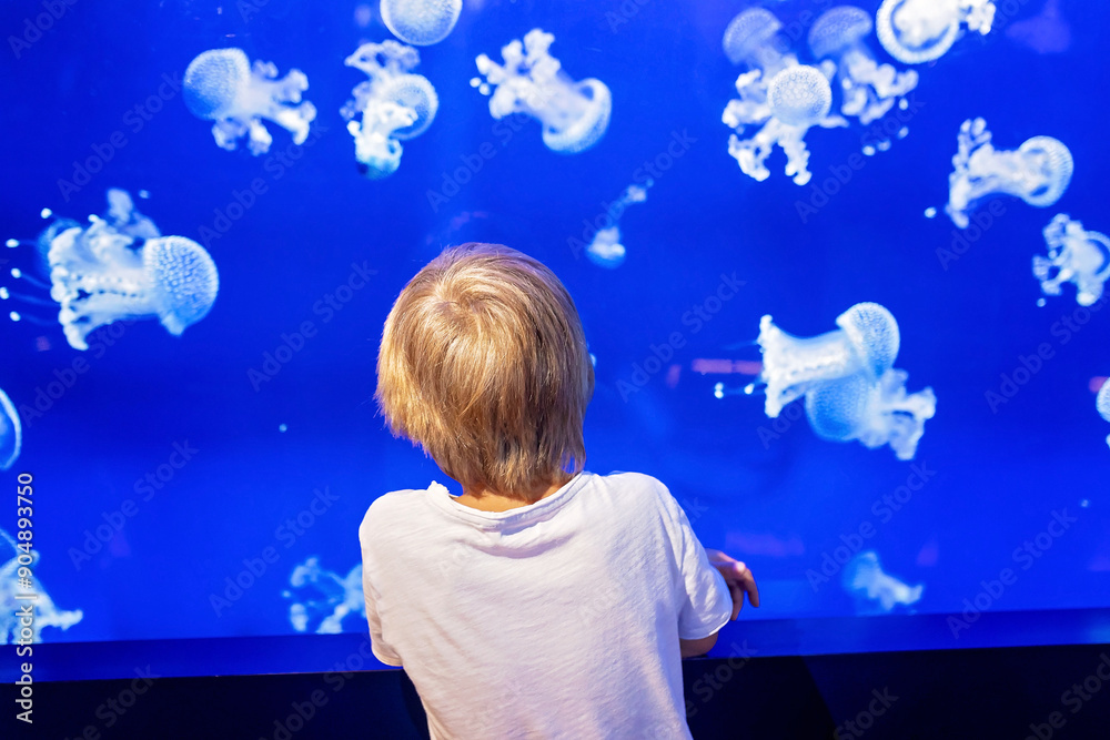 Little boy, kid watching the shoal of fish swimming in oceanarium, children enjoying underwater life
