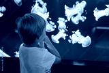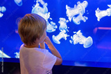 Little boy, kid watching the shoal of fish swimming in oceanarium, children enjoying underwater life