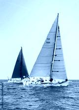 Sailboats races in regatta near Brindisi under blue sky. Crew members working together on deck