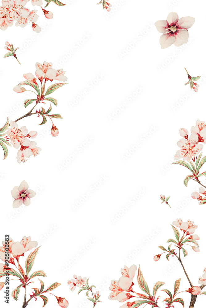 Vintage Japanese png floral frame peach blossoms and hibiscus art print, remix from artworks by Megata Morikaga