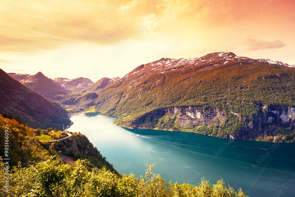 View of the Geiranger fjord from Ornesvingen Viewpoint. Beautiful nature of Norway