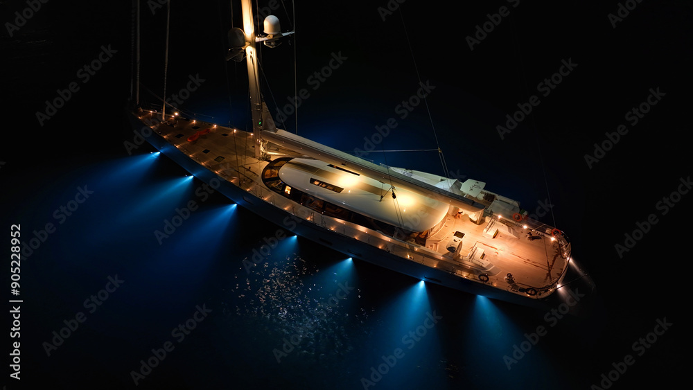 Aerial drone night shot of beautiful illuminated luxury sail boat with wooden deck anchored in deep blue Mediterranean sea