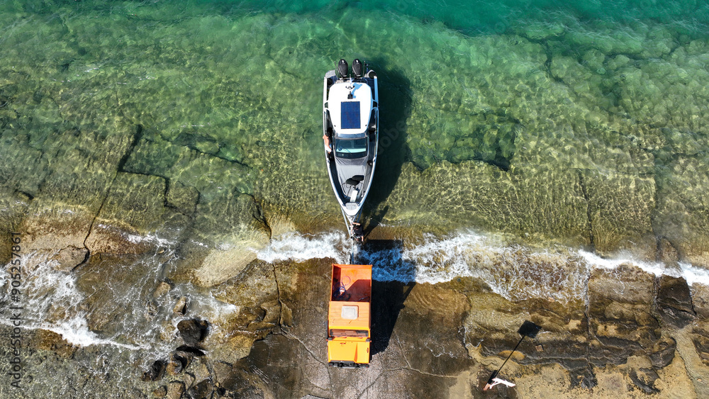 Aerial drone top view photo of speed boat on trailer being towed by truck from emerald exotic sea to land