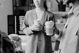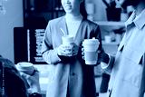Group of unrecognizable young people holding reusable cups having coffee break at work in office