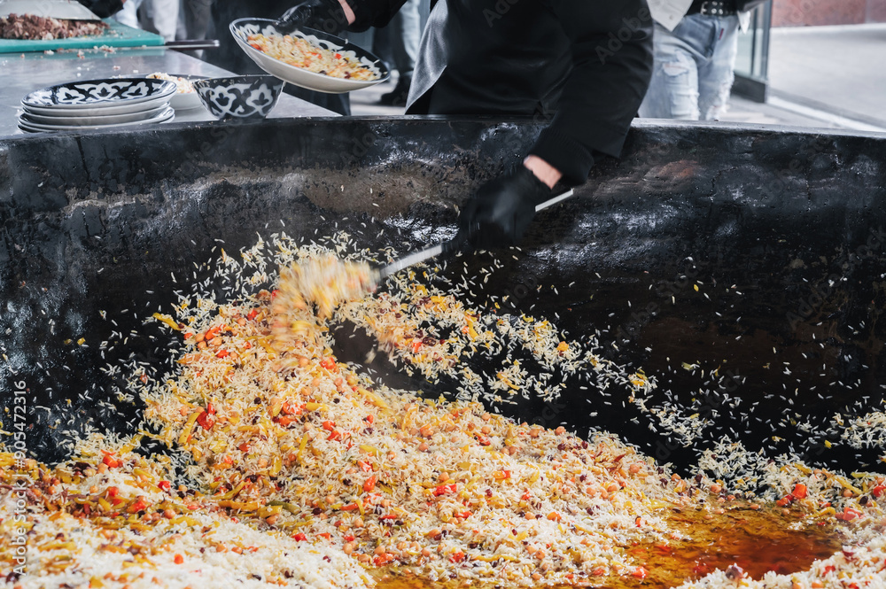 male cook cooked Uzbek pilaf from cauldron on a plate in the kitchen. Traditional Oriental Arabic cuisine. Central Asian Pilaf Center Besh Qozon in Uzbekistan in Tashkent