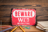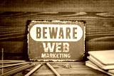 Web Marketing. Beware sign with text on a wooden texture office table