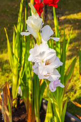 Close-up view of white gladiolus flowers growing in garden pot in garden.