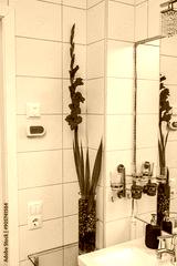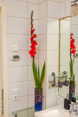 Beautiful interior view of bathroom with red gladiolus in tall crystal vase on countertop, next to mirror and sink with accessories.