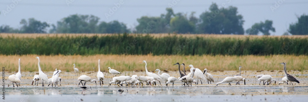 Huge spoonbill and heron flock. Wading birds in dry lake Zicksee in Austria.