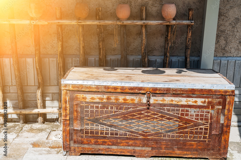 old traditional vintage Uzbek wooden chest with a metal pattern on the street