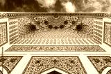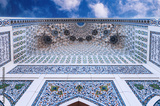 decor of white marble wall tiles with traditional Uzbek Islamic pattern ornament on Masjid Minor Mosque in Tashkent in Uzbekistan on background sky