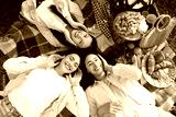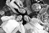 Female friends lying on picnic in park, top view