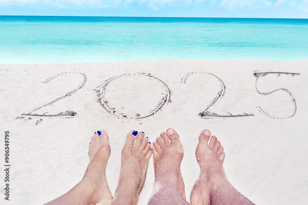 Top view of 2025 numbers written on the sand of coastline with frothy waves
