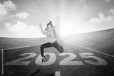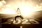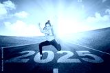 Female college student jumping over the number 2025 on the road with upward arrow