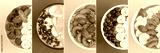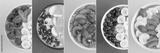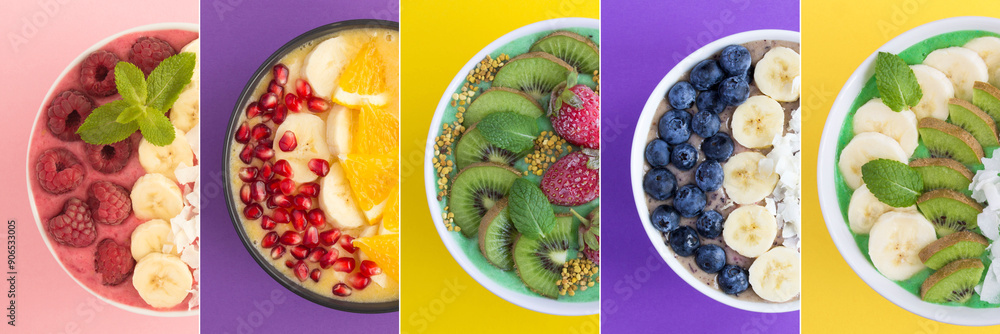 Collage of smoothie bowls with fruit and berry on the colored background. Top view. Close-up.